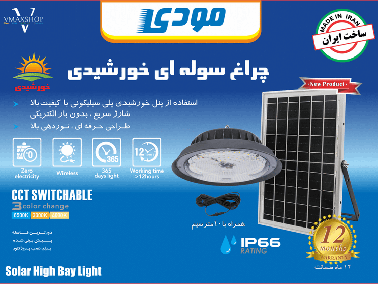 چراغ سوله ای خورشیدی 400 وات مودی یک راهکار روشنایی صنعتی و کارگاهی با قابلیت نصب آسان و بدون نیاز به کابلکشی برق شهری است؛ از طریق پنل خورشیدی مجزا شارژ شده، نوردهی بالا با لامپهای SMD ارائه میدهد و با کنترل از راه دور، امکان تنظیم رنگ نور، شدت نور و زمان کارکرد را فراهم میکند.