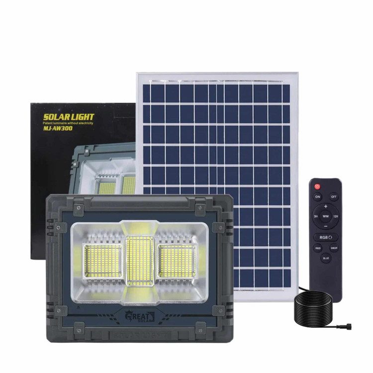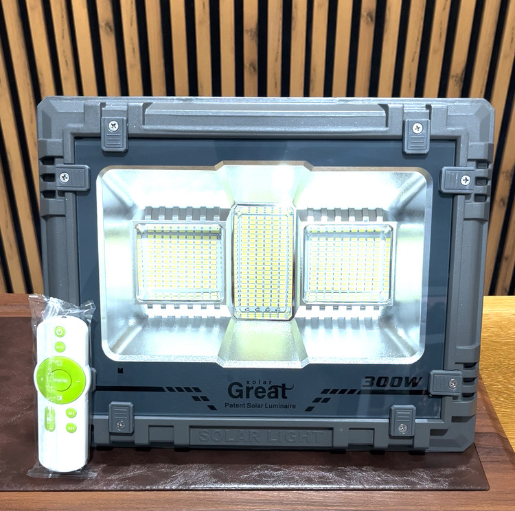 پروژکتور خورشیدی 300 وات GREAT SOLAR با پنل خورشیدی 20 وات 5 ولت که به صورت جداگانه از پروژکتور نصب می شود و درجه آزادی بیشتری برای نصب پروژکتور در نقطه بهینه فراهم می کند. این پروژکتور دارای باتری داخلی به ظرفیت 15 آمپر ساعت است و به خاطر داشتن ظرفیت بالای باتری قابلیت روشن شدن یک شب کامل را دارد. باتری این پروژکتور از نوع لیتیوم یون بوده و طول عمر بالایی دارد و قابلیت تعویض و تعمیر را نیز داراست.